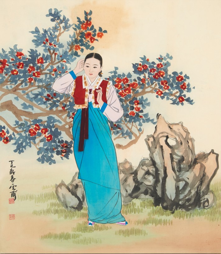 운보 김기창(雲甫 金基昶 1913-2001)은 화단에 등단할 때부터 혜원 신윤복(蕙園 申潤福 1758-?)의 미인화를 모사할 정도로 인물묘사에 깊은 관심을 보였다. 또한 ‘시집가는 날’이나 ‘널뛰는 모습’ 등 여성의 다양한 일상을 즐겨 그리며 미인화의 전통을 현대적으로 재구축하였다. 여인의 전신상을 그린 <미인도>는 한국 근대 여성의 용모를 강렬한 원색과 역동적 필치로 제시한 김기창의 대표적인 미인도로, 코리아나 화장품이 지속적으로 관심을 가지고 수집해 온 여인화 소장품 중 대표작이다. 빨갛게 피어난 동백꽃과 여인이 입은 붉은 배자, 동백나뭇잎과 치마의 푸른색이 만들어내는 색채의 조화와 리듬감은 화폭에 활기를 불어넣어준다. 머리를 매만지는 모습은 자연스럽게 관객의 시선을 얼굴로 끌어내며, 가늘고 긴 눈썹과 작은 입술, 둥근 얼굴형 등 한국 여인의 아름다움을 강조한다. 배경의 바위는 외곽선을 딴 선묘를 기반으로 엷게 채색이 들어간 전통 한국화의 화법으로 그렸는데, 동백나무는 외곽선이나 나뭇가지 마디의 표현을 생략하고 색면을 중심으로 그려 마치 서양화의 기법을 적용한 듯하다.