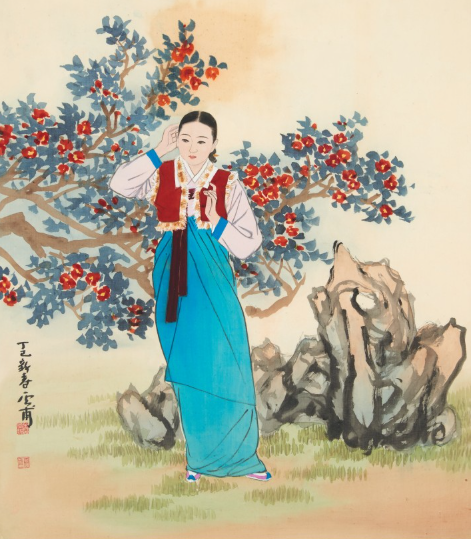 그리고 일제 강점기 시기 일본화 기법의 유입과 함께 주요 근대적 장르화로 부각되면서 새로운 전통을 만들어 갑니다. 특히, 당시 수묵담채화 중심의 전통 화단에 다채로운 색채를 추가하여 채색화 바람을 불러 주도했던 인물은 김은호(1892-1979)가 있습니다. 김은호의 미인도는 사실적인 묘사와 유려한 선묘의 세필기법과 부드러운 색채 표현이 특징입니다. 그리고 김은호의 기법들은 그의 문하생 김기창(1913-2001), 장우성(1912-2005), 배정례(1916-2006) 등에게 이어져 근대 미인화의 새로운 전통이 세워지게 됩니다.