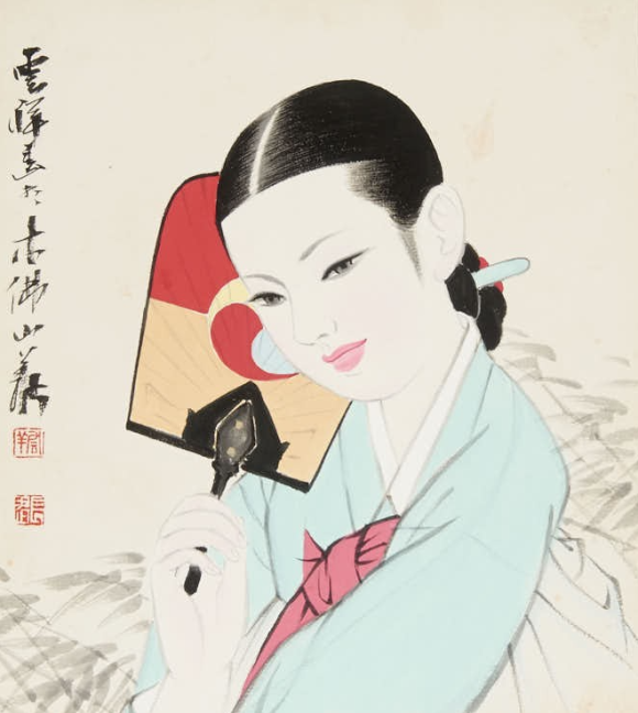더불어서 코리아나미술관의 소장품 장운상(1926-1982)의 <미인도>(연도미상)를 통해서도 미인도의 현대화의 방향을 살펴볼 수 있습니다. 장운상은 장우성의 지도를 받았으며 고운 필선과 밝은 색채를 사용한 것이 특징입니다.